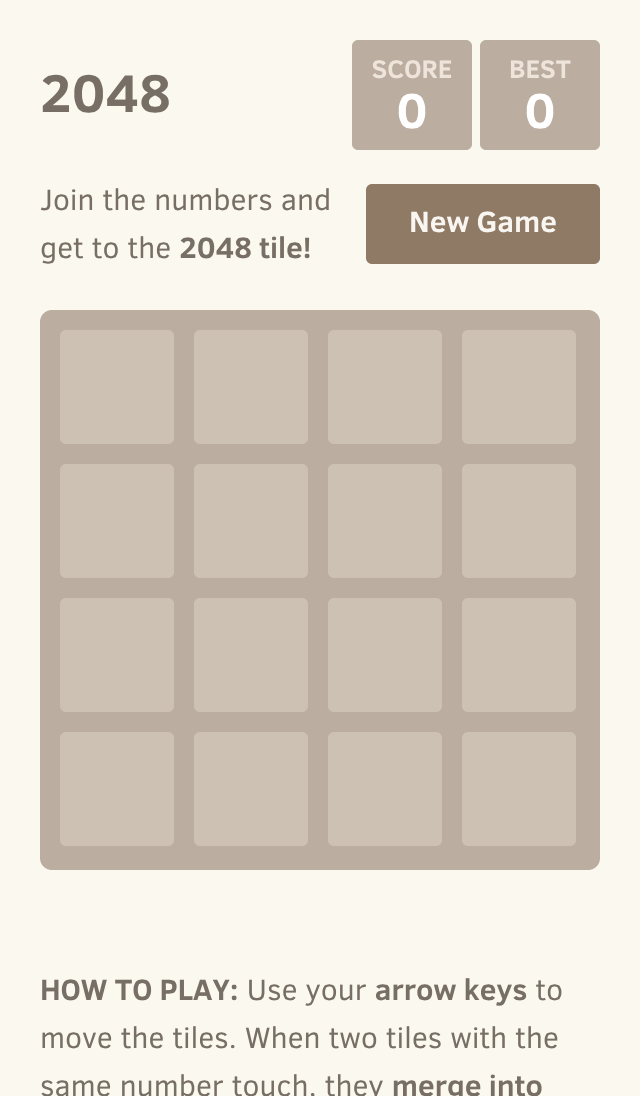 NEW GAMEHow to play: Use your arrow keys to move the tiles. When two tiles with the same number touch, they merge into one!